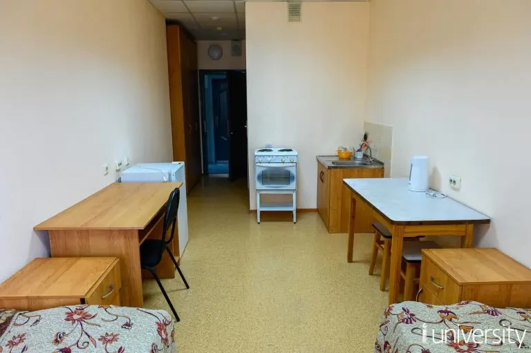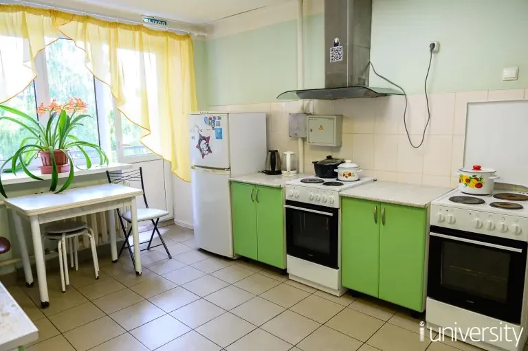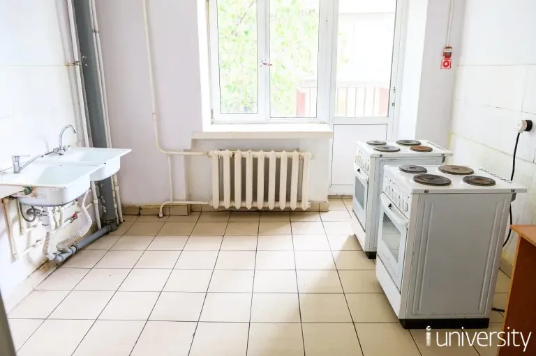 На каждом этаже имеется по 2 общих кухни. Студенты размещены в 4-х секциях, в каждой из которых 2-х местные комнаты. Обучающиеся обеспечены необходимым комплектом постельного белья.