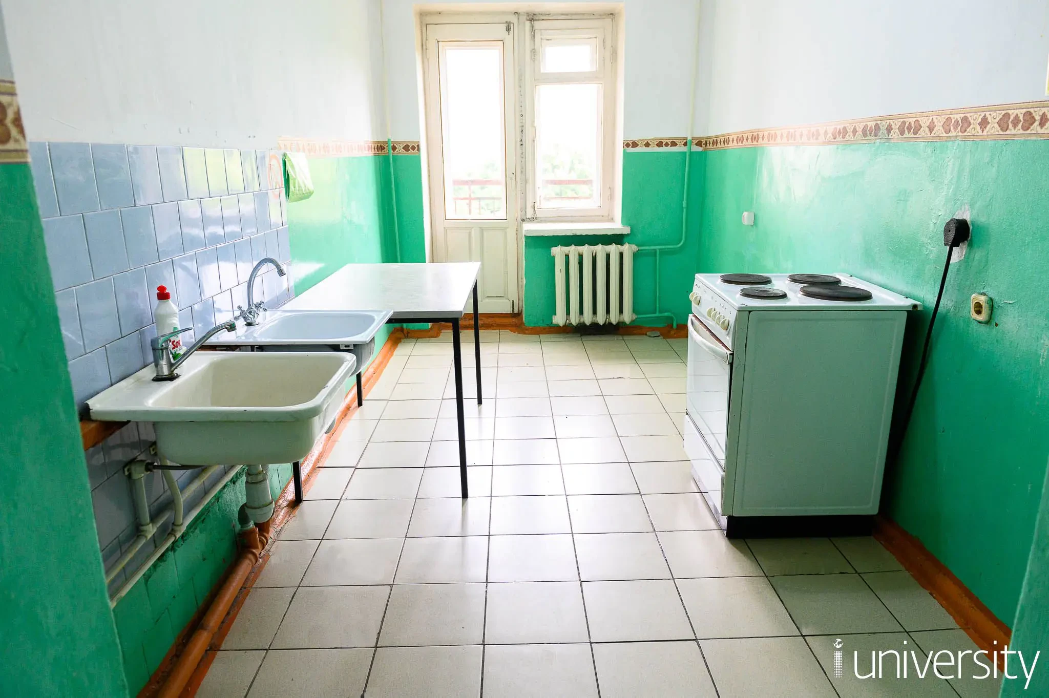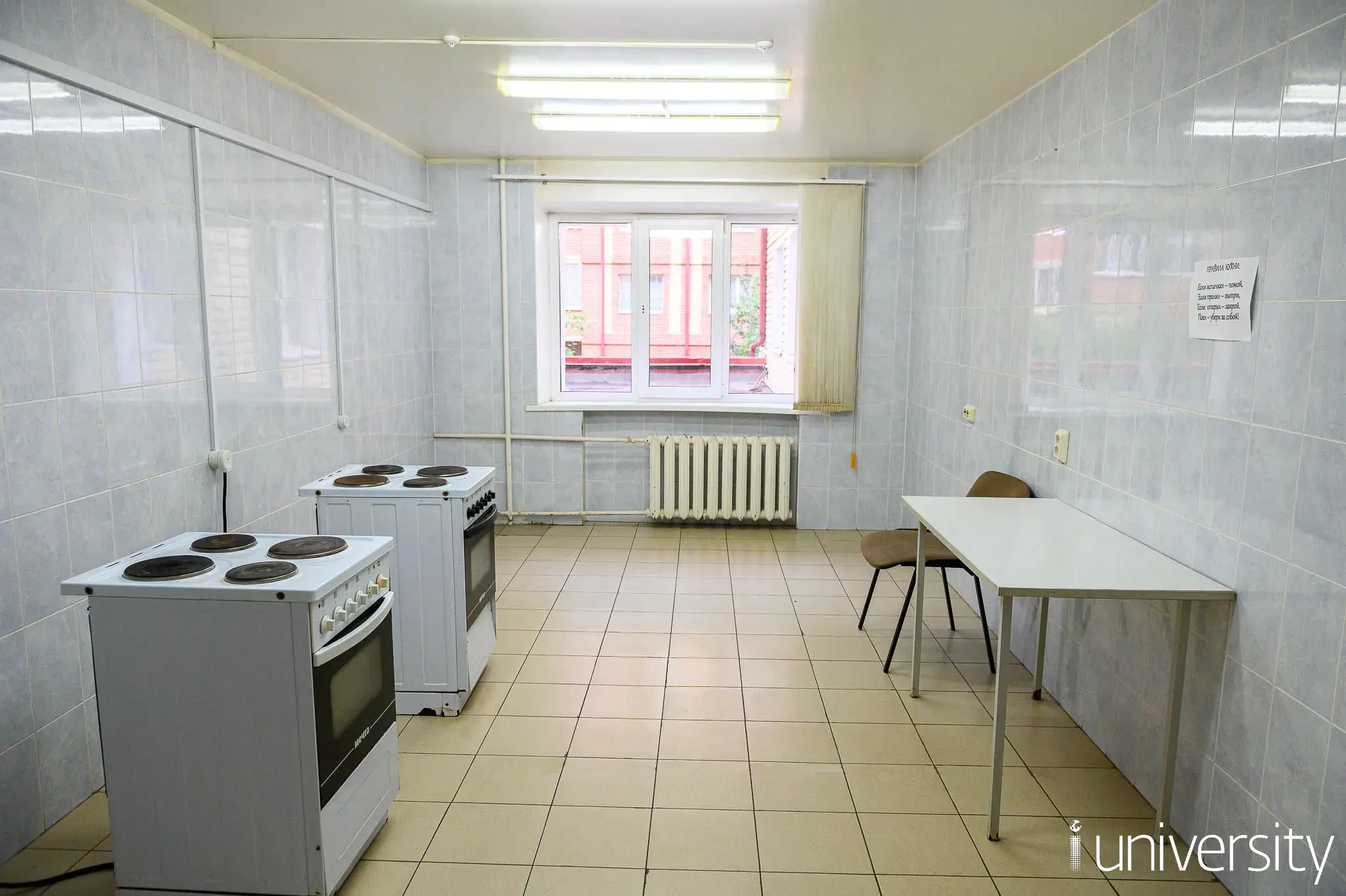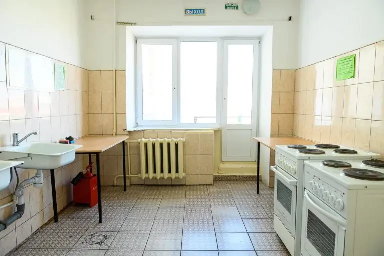 В секции общежития расположены 2 туалета, 2 душевые комнаты, умывальная комната и общая кухня, оснащенная 2 электрическими плитами и столами.