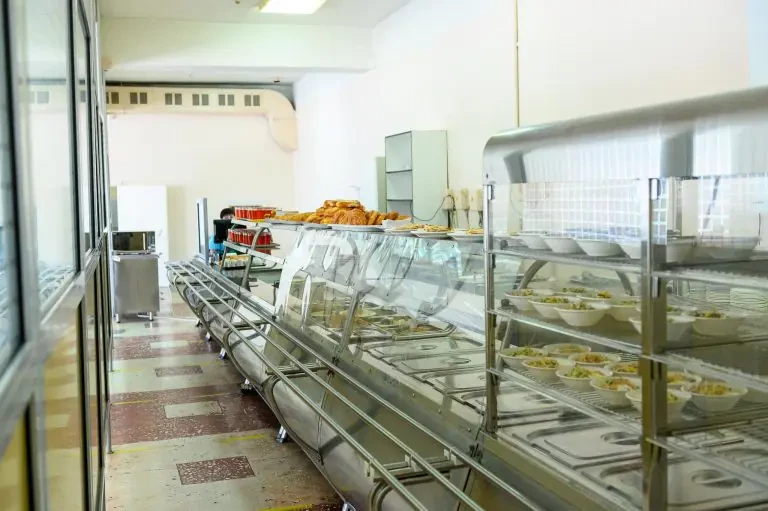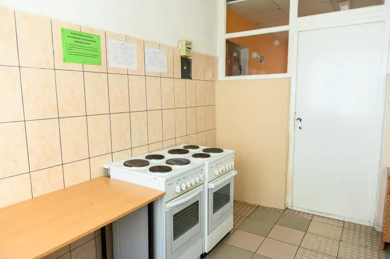 На секции имеется кухня, оснащенная 2 электрическими плитами, столами и раковинами.