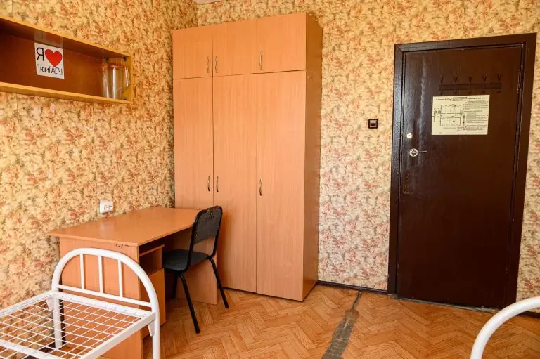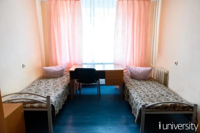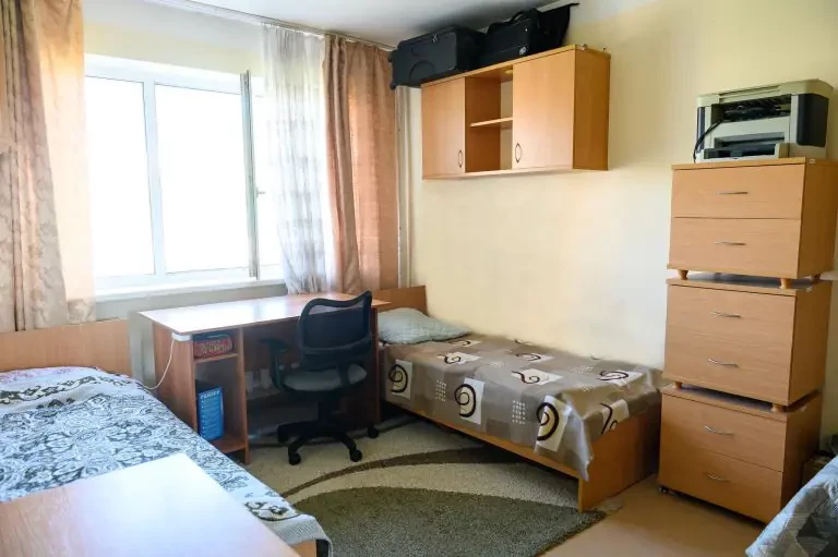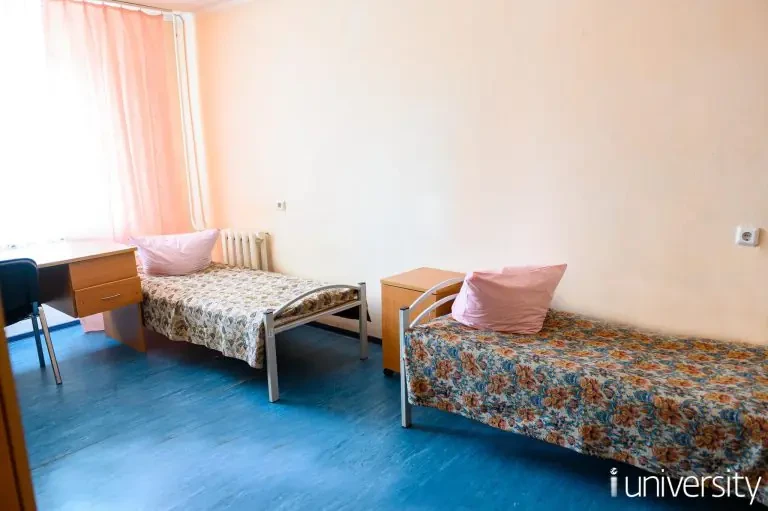 Размещение в комнате по 2 и 3 человека. Каждая комната оборудована столом, шкафом, кроватями, прикроватными тумбочками и стульями. Проживающие в общежитии обучающиеся обеспечены матрацем, подушкой, одеялом, покрывалом, комплектом постельного белья.