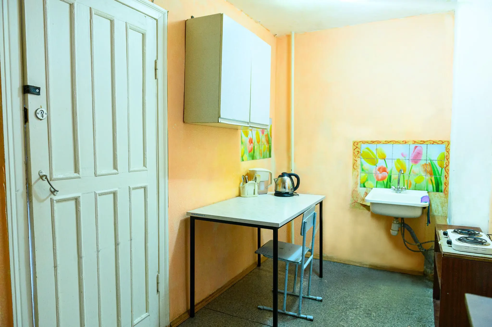 На каждом этаже по 4 секции, 2 общие кухни, оснащенные электрическими плитами и столами, 2 туалета и умывальных комнаты.