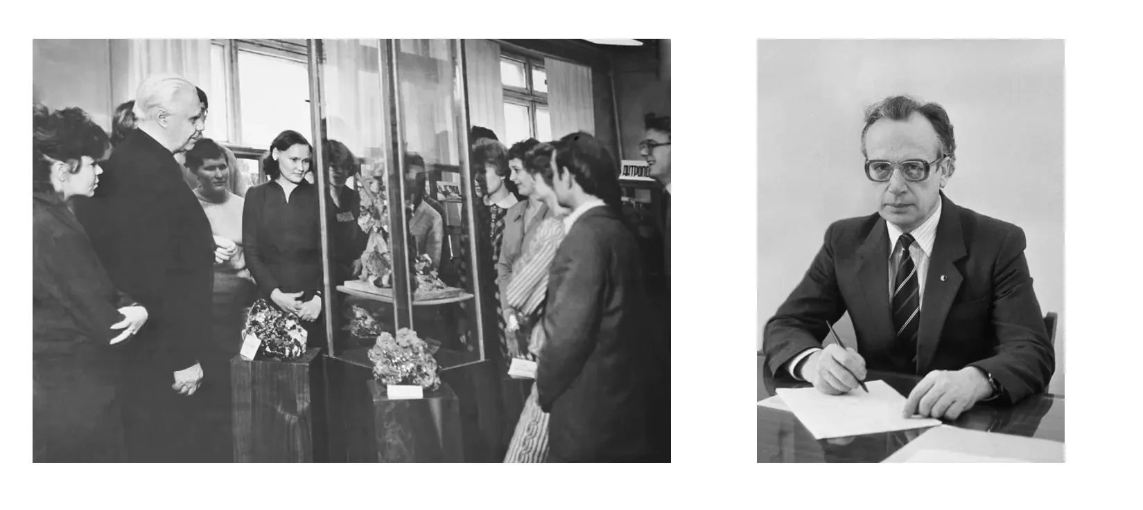 Ермаков Василий Константинович (1909-1992), доктор геолого-минералогических наук, профессор. Трудовую деятельность в ТИИ начал с 25 июня 1964 г. доцентом кафедры общей геологии. В 1969 г., защитив докторскую диссертацию, как большой знаток и ценитель минералов совместно со своими помощниками Ю.П. Сорокиным и Ю.С. Папиным вплотную занялся созданием геолого-минералогического музея. По воспоминаниям Василия Константиновича начиналось всё так: «По учебному плану нужны были коллекции, их стали собирать. Стали ежегодно посылаться экспедиции в тот или иной район страны. География этих экспедиций — Урал, Сибирь, Дальний Восток…».