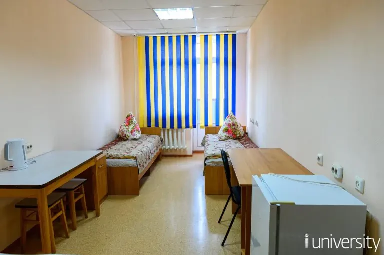 Размещение в комнате по 2 и 3 человека. Каждая комната оборудована столом, шкафом, кроватями, прикроватными тумбочками и стульями. Проживающие в общежитии обучающиеся обеспечены матрацем, подушкой, одеялом, покрывалом, комплектом постельного белья.