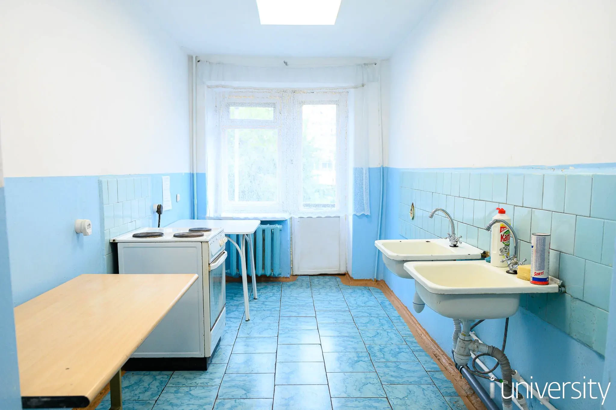 В секции общежития расположены 2 туалета, 2 душевые комнаты, умывальная комната и общая кухня, оснащенная 2 электрическими плитами и столами.