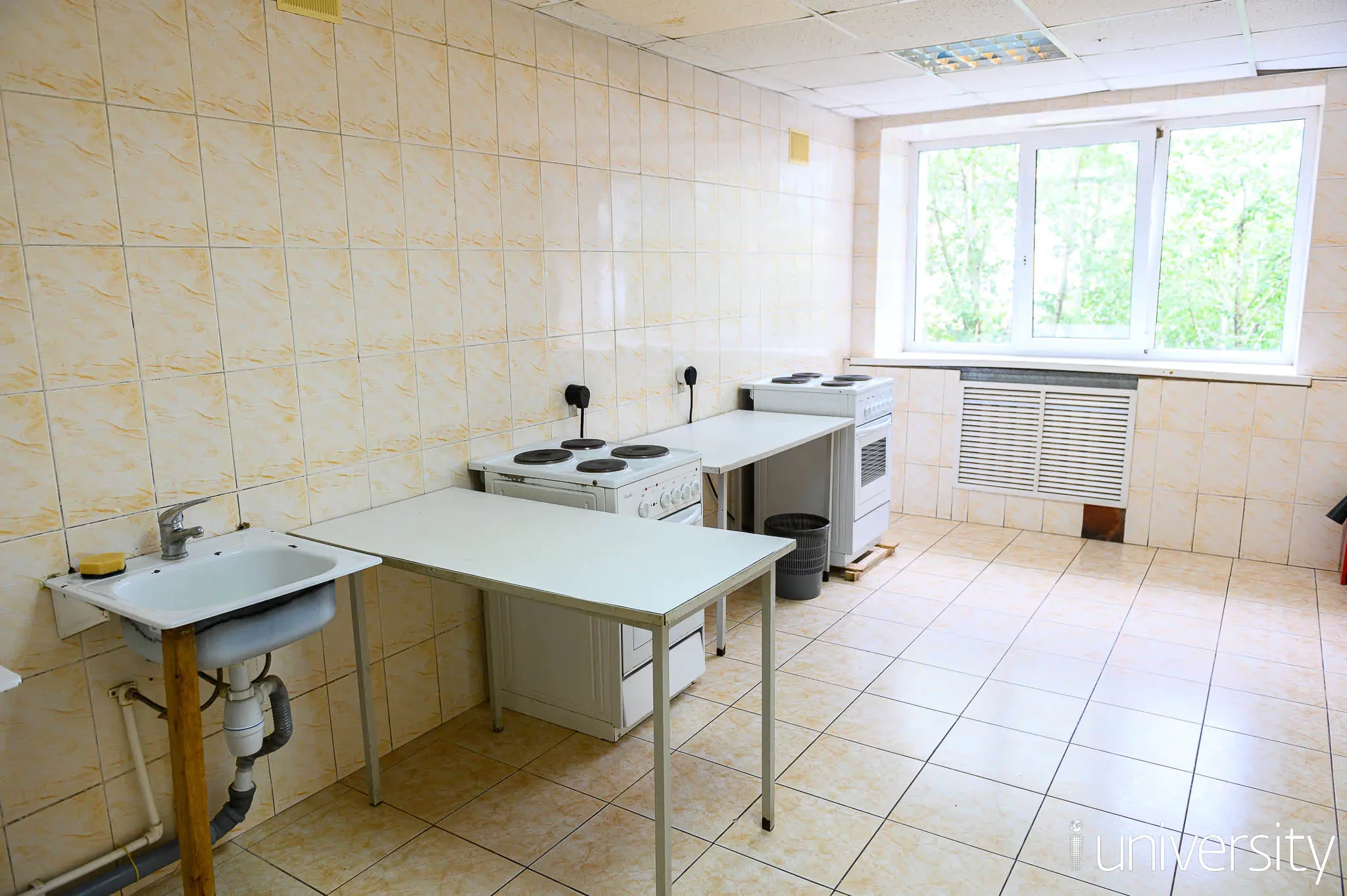 На секции имеется кухня, оснащенная 2 электрическими плитами, столами и раковинами.