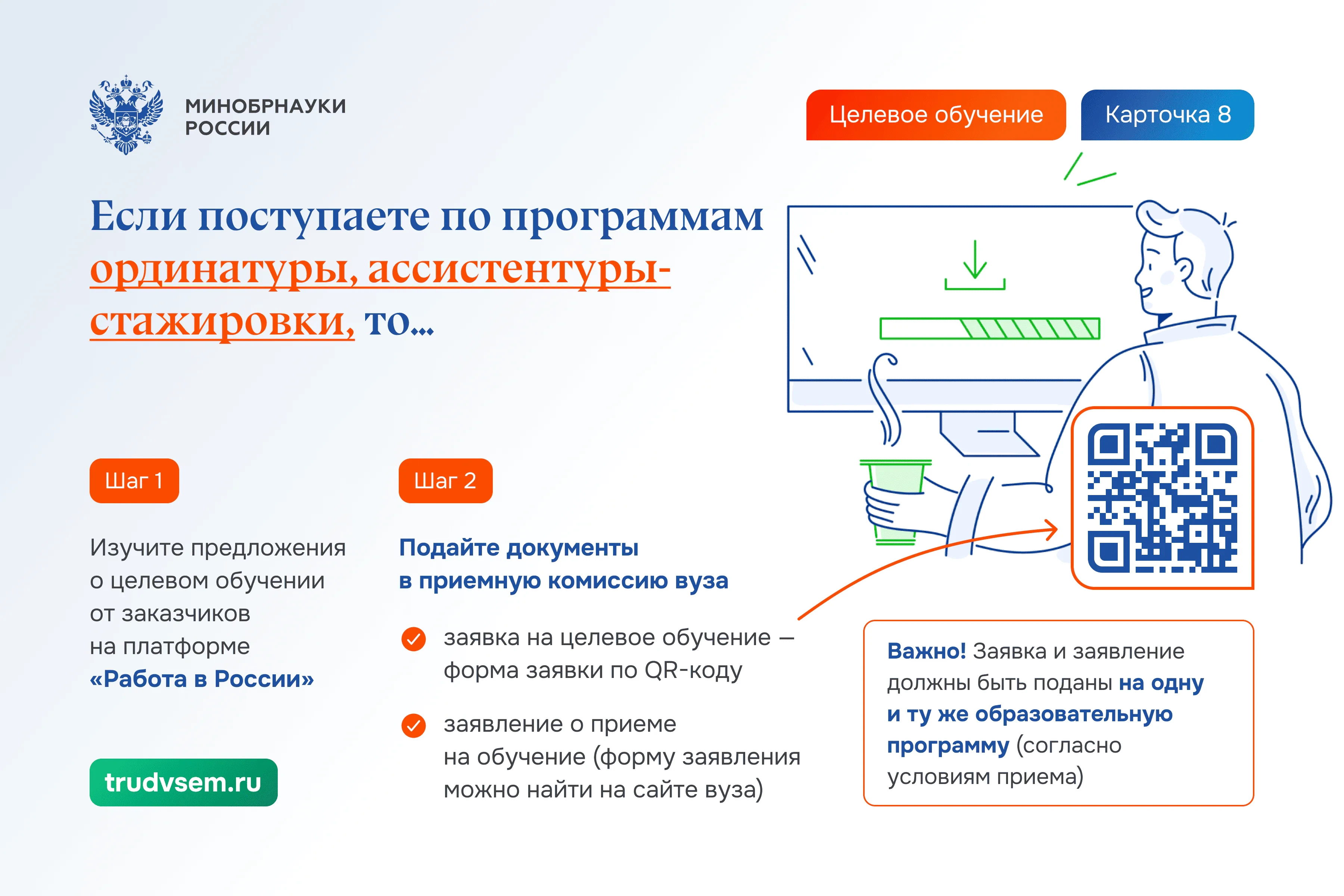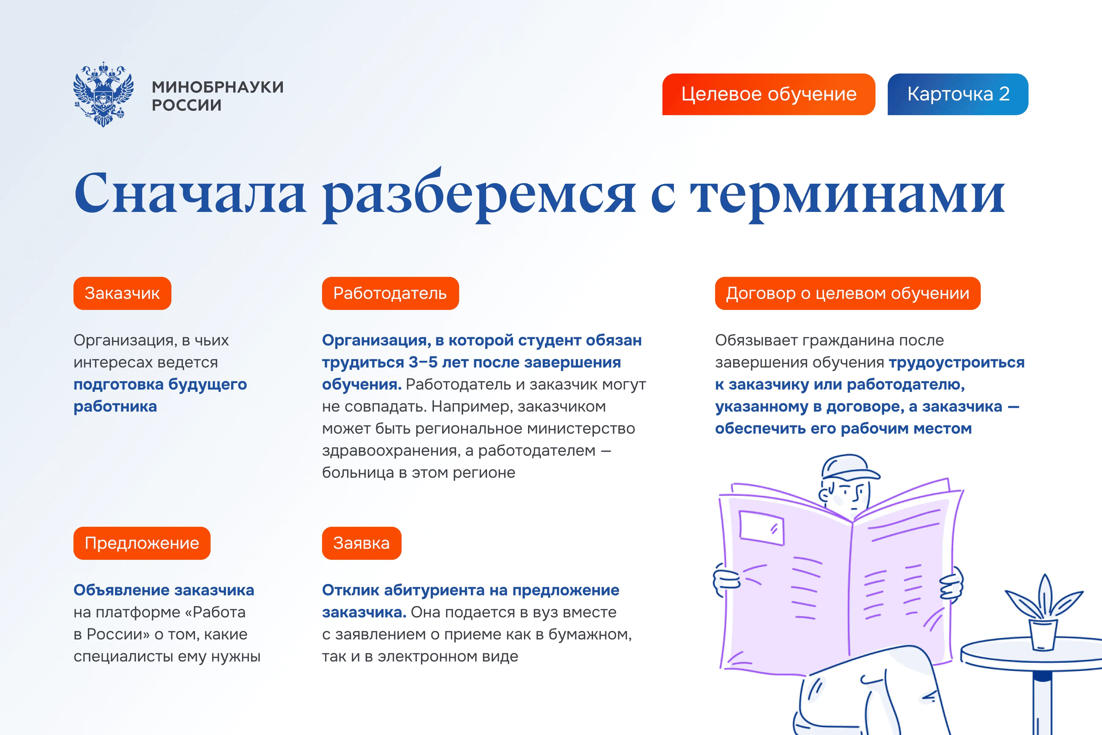 Система поступления будет базироваться на двух платформах – «Работа в России» и на портале «Госуслуги». Для начала работодатели размещают на портале «Работа в России» предложения о заключении целевого договора, в котором указывают требования к будущему кандидату. Будет видно, какие целевые места имеются в разных регионах, что позволит абитуриенту выбрать место для обучения и будущей работы не только в своем регионе. Договор о целевом обучении заключается после зачисления абитуриента в вуз, но до начала учебного года. Заключить договор можно только с одним работодателем.